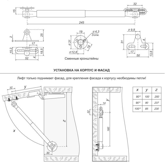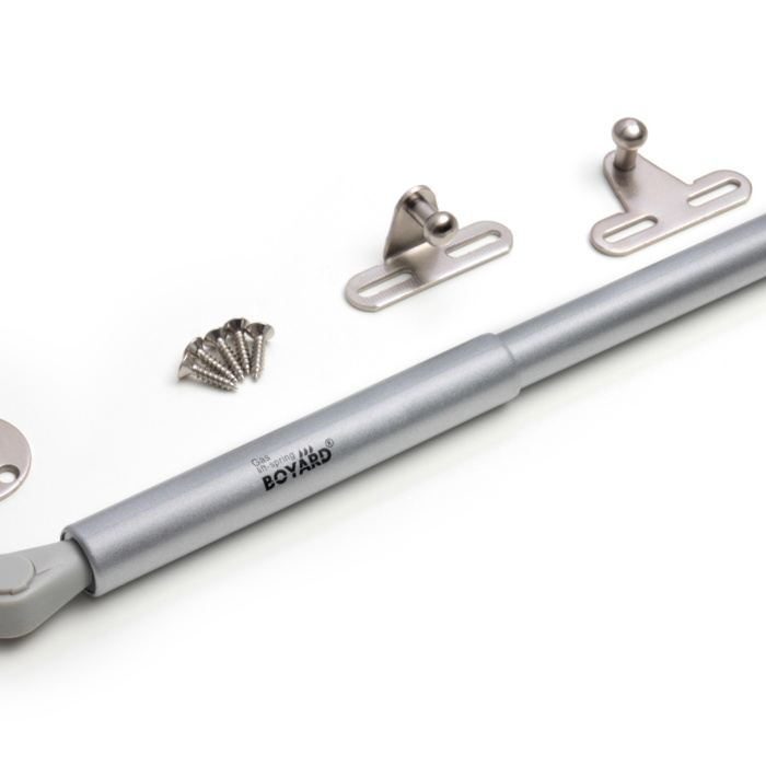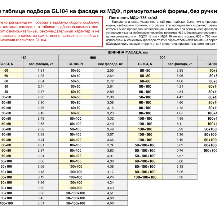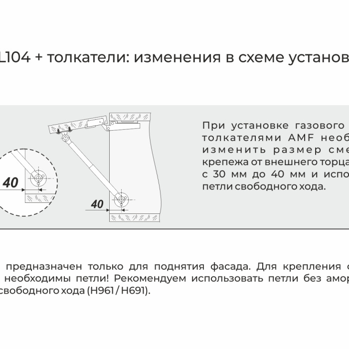GL104 — газовый лифт, который открывает фасад вверх и может фиксировать его в любой точке. Представлен в 3 вариантах номинального усилия: 50N, 80N и 100N и рассчитан на 60 000 циклов открывания/закрывания. Шток лифта GL104 защищён от возможного попадания пыли и влаги дополнительной алюминиевой трубкой, а обновленная легкосъемная конструкция фиксаторов упрощает процесс монтажа/демонтажа механизмов. GL104 поставляется в комплекте с тремя кронштейнами — для крепления к боковой стенке корпуса, для крепления к фасаду из плитных материалов (ЛДСП/МДФ) и к фасаду из алюминиевого профиля. Для открытия от нажатия рекомендуется установка с толкателем (на выбор с AMF 10 по AMF15) и петлями Н961 или Н691. При таком варианте схема монтажа поменяется, необходимо изменить размер смещения крепежа с 30 до 40 мм. Эти изменения отражены в схеме в карусели фото карточки.