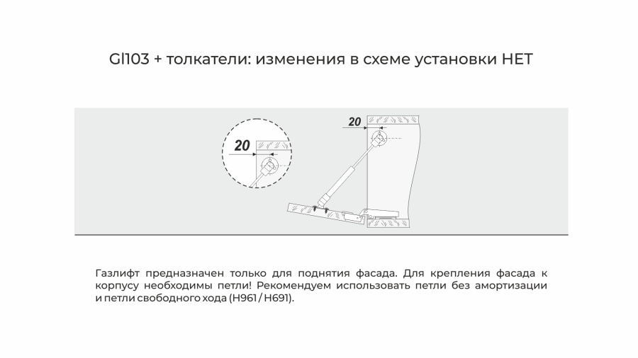 GL103 поставляется в комплекте с тремя кронштейнами — для крепления к боковой стенке корпуса, для крепления к фасаду из плитных материалов (ЛДСП/МДФ) и к фасаду из алюминиевого профиля.