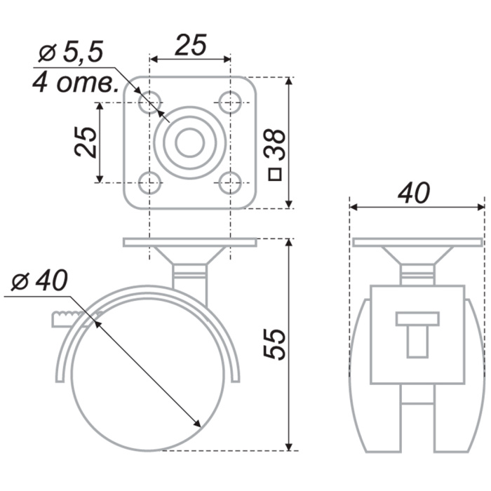 Колесо мебельное d=40 мм, с тормозом и площадкой для крепления.
