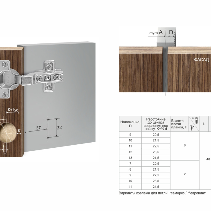 Способ монтажа петли: Под евровинт и саморез, с d отверстий 5,5 мм