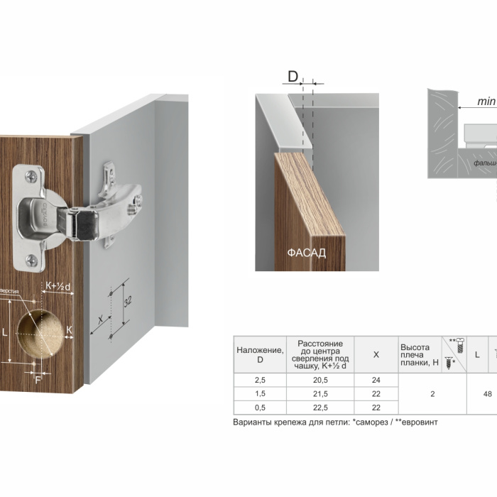Способ монтажа петли: Под евровинт и саморез, с d отверстий 5,5 мм