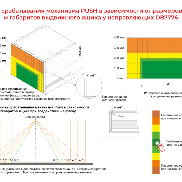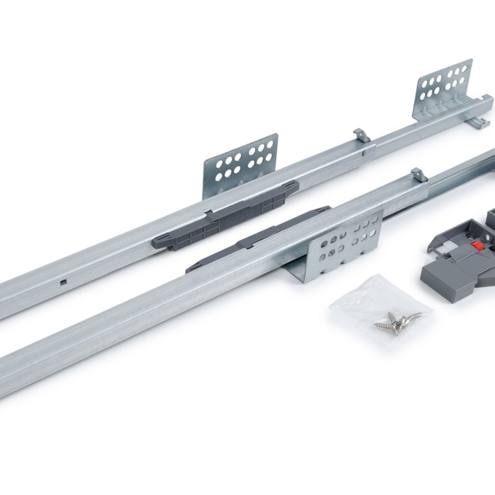 B-Slide DB7776 — направляющие скрытого монтажа неполного выдвижения с клипсой с открытием от нажатия для мебели малых форм без ручек. Направляющие обеспечивают комфортное движение, лёгкое открывание от нажатия на фасад и имеют защиту от случайного открывания «на себя» на протяжении 100 открываний. Модель обеспечит бесперебойную работу на протяжении 40 000 циклов открывания / закрывания и имеет дифференцированную нагрузку, учитывающую конструкцию мебели: 300 мм – 15 кг, 350 – мм 17,5 кг, 400 мм – 20 кг, 450 мм – 22,5 кг, 500 мм – 25 кг. DB7776 рекомендованы для прихожих, гостиных, спален и другой компактной мебели с небольшой глубиной выдвижных ящиков.