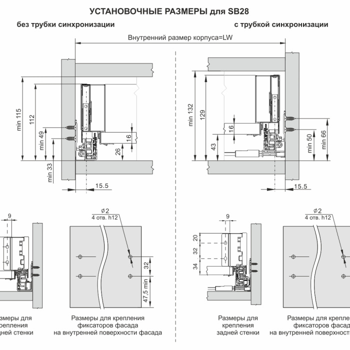 СТАРТ PUSH SB28 — комплект систем выдвижения для сборки выдвижного мебельного ящика с прямыми боковинами стандартной высоты с открытием от нажатия для мебели без ручек.